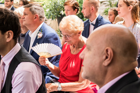 Dann endlich war es soweit - die Trauung begann, und C lief am Arm ihres Papas den Weg entlang, zwischen den Gästen hindurch und auf ihrem Bräutigam N zu. Diese Momente liebe ich besonders! Der Augenblick, in dem sich Braut und Bräutigam das erste Mal sehen, die Emotionen und wie berührt sie dabei sind. Begleitet wurde der Einzug durch den perfekten Gesang von Ursula - sie hat auch die Trauung gehalten und ist dabei ganz wunderbar persönlich auf das Paar eingegangen. Es wurde so viel gelacht und alle hatten Spaß!